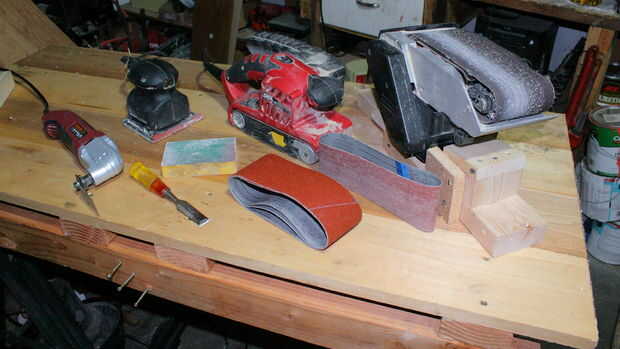 Las herramientas de izquierda a derecha son una lijadora de Palma, lijadora de banda y una lijadora de banda en un soporte. El último tiro es una lijadora de disco. También lo verde es esponja de lija de mano. En la foto no es pero es muy útil una lijadora orbital.