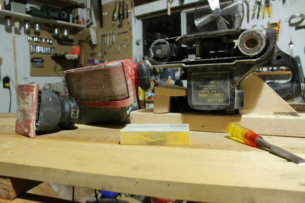 Lijadoras de banda tienen una correa hecha de papel de lija que gira las ruedas. Es como las pistas de un tanque del ejército o un bulldozer. Si no mantiene apretado puede conducir en usted. Esta herramienta es ideal para el papel de lija áspero y eliminación de mucho material. Por ejemplo, si una articulación tiene un poco de una repisa que se puede sentir cuando ejecute o de los dedos sobre él, unos cuantos golpes con la lijadora de banda curará esto rápidamente. Tenga cuidado sin embargo, es muy fácil de quitar demasiado material con una lijadora de banda y causa tantos problemas como se soluciona. También tenga cuidado cuando arrancar la herramienta. Si está en contacto con la madera al golpear el botón de encendido que va a menudo tirón y cero contra el grano de madera. También si mantener la herramienta en el aire y empezar ser muy cuidadoso mantener nivel y establece con cuidado. Si viene en demasiado afilados de y del ángulo va cavar una pequeña zanja.