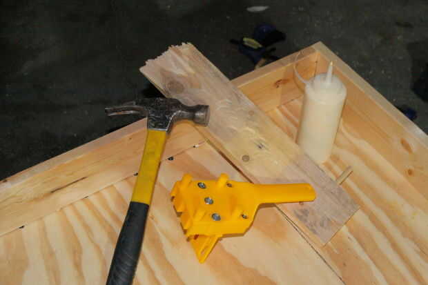 Una vez todos los agujeros son taladrados en la segunda pieza, Aplique pegamento en los orificios y pasadores expuestos y la primera pieza del martillo en los agujeros de su compañero. (Foto 7) Entonces su acabado!