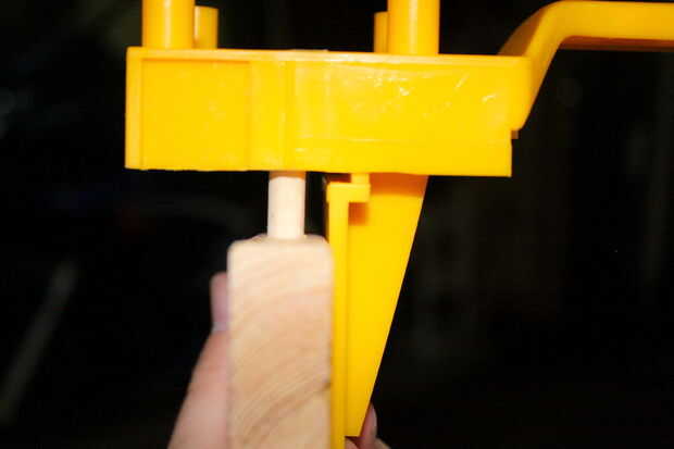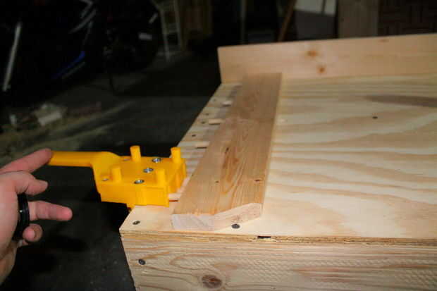 A continuación Sujete la primera pieza de la segunda pieza de modo que los tacos del punto hacia donde va, en definitiva, va en la segunda pieza (Foto 3 y 4). En la plantilla hay espacios que se alinean con el buje (Foto 5). Utilice la ranura para alinear la plantilla hasta tacos de la primera pieza y luego deslice la plantilla hasta los 90 grados pieza cumple con que la pieza de trabajo y luego el casquillo será exactamente donde el orificio tiene que ir por los tacos para reunirse. Perfore a través del buje en ese punto (foto 6)