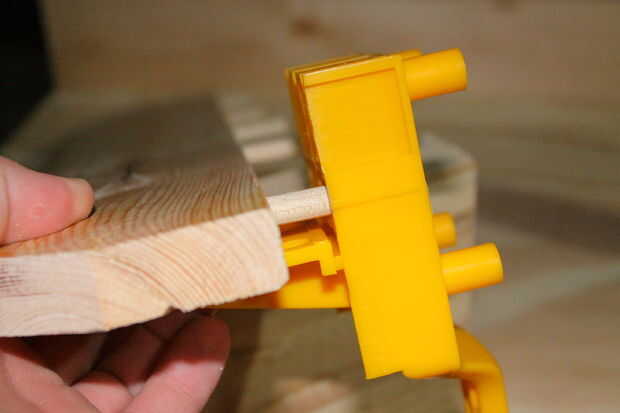 Una vez que todos los agujeros son taladrados en la primera pieza, el siguiente paso es perforar los agujeros que coinciden en su pedazo de mate. Estos agujeros en el pedazo de mate que empareja perfectamente para los tacos. Para ello ponemos un taco en la pieza taladrada original, luego que pasador en el orificio del buje y deslice el 90 grado aliment parte de la plantilla (la parte inferior de la plantilla en pic1) hasta el lado de la madera entonces atorníllela firmemente (hay dos tornillos en la parte posterior de la plantilla que no se puede ver en la imagen).