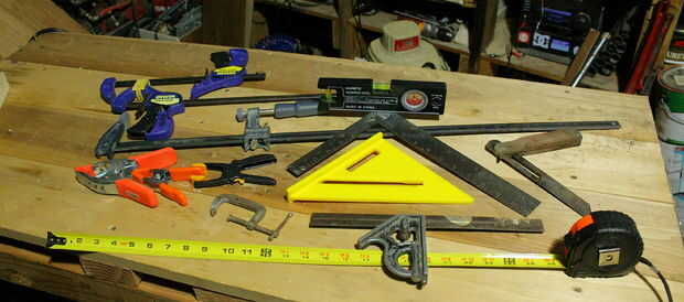 Esta es una pequeña colección de pinzas y aparatos de medición utilizo a menudo. Abrazaderas de apretón y mantenga las cosas en su lugar mientras el pegamento se seca, o para mantener las cosas alineadas mientras en tornillos o espigas. Nunca puede tener suficientes abrazaderas.