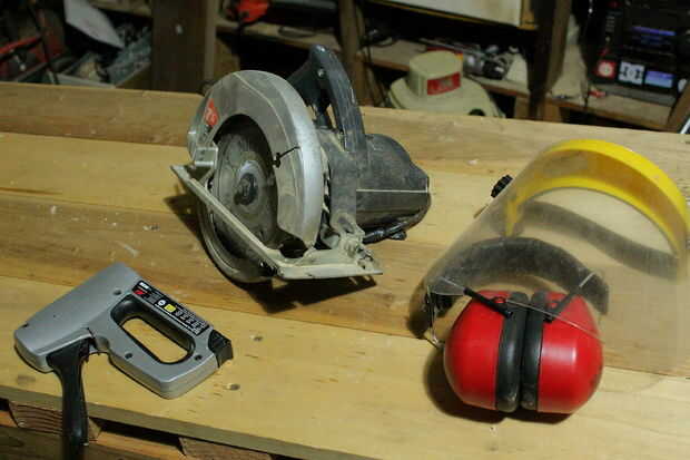 La Sierra Circular. Esto es una gran herramienta para cortar madera pero sus muy ruidoso y puede ser inseguro sin el apoyo de caballo de sierra adecuada. Si uno (Lamentablemente como yo) no es dueño de una sierra de mesa esta herramienta es su opción para el corte longitudinal de madera al tamaño adecuado. Hay pinzas especiales de borde recto que hacer cortes precisos. Observe en este tiro la protección de ojos y oídos. Estas sierras son ruidosos y no sean un campeón ahora ser sordos más tarde. Puede tener un ojo de repuesto pero no se arriesgue a sea.