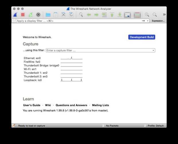 Vaya a su menú de inicio (en Windows), la barra de tareas (en Linux) o la carpeta Aplicaciones (Mac) e inicie Wireshark. Debería ver una ventana no muy diferente de la imagen para este paso.