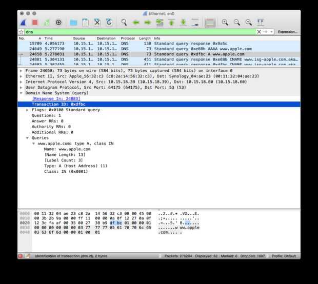 Puedo encontrar la respuesta a una consulta DNS buscando la respuesta correspondiente. Yo puedo hacer clic a través de todas las respuestas en la captura, pero también puedo hacer Wireshark hacer el trabajo difícil por filtrando por el ID de transacción que cada intercambio de mensaje DNS tiene. La forma más sencilla de hacerlo es hacer clic primero en la línea que dice "ID de transacción:" (imagen 4), entonces lo (imagen 5) con el botón derecho, seleccione "como filtro" (imagen 6) y luego haga clic en "seleccionados".