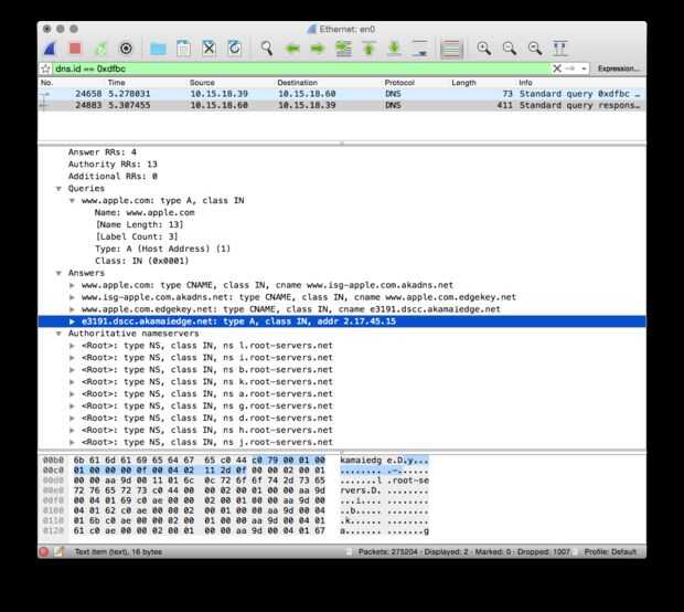 La pantalla de Wireshark mostrará ahora sólo el intercambio de mensajes DNS entre mi ordenador y el servidor DNS sobre "www.apple.com". Como puede ver en la imagen final, www.apple.com tiene la dirección IP 2.17.45.15.