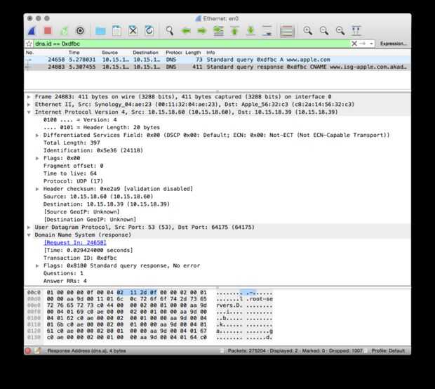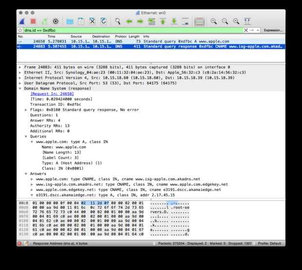 Así que si la dirección IP que estamos buscando es 2.17.45.15 y queremos que todo el tráfico desde o hacia esa dirección IP y combinando esa parte con las dos palabras clave que hemos encontrado antes, encontrar el tráfico relevante para www.apple.com podría hacerse utilizando el filtro de la pantalla "ip.src == 2.17.45.15 OR ip.dst == 2.17.45.15"