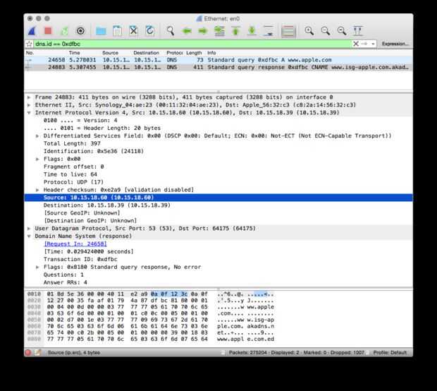 Ahora que sé www.apple.com tiene dirección IP 2.17.45.15 que quiero ver todo el tráfico desde y hacia esta dirección IP. Hay varias maneras de lograrlo y voy a mostrar las dos estrategias más útiles. También ambos muestran dos diferentes maneras para descubrir palabras clave filtro de pantalla.