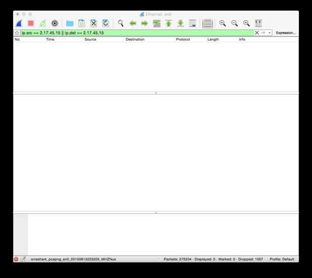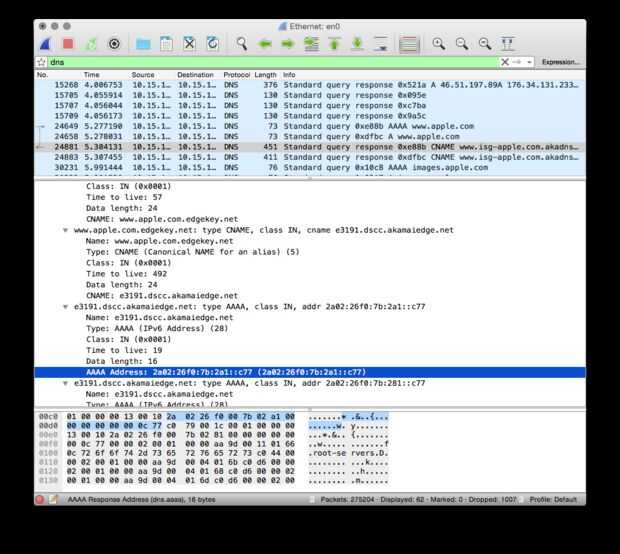 Después de ejecutar el filtro de la pantalla "ip.src == 2.17.45.15 OR ip.dst == 2.17.45.15" Wireshark me muestra una ventana vacía resultado (captura de pantalla 1). Por alguna razón, no hay ningún tráfico IPv4 va de www.apple.com. ¿Pero Agárrate, tengo IPv6, así que tal vez DNS también devuelve una dirección IPv6?