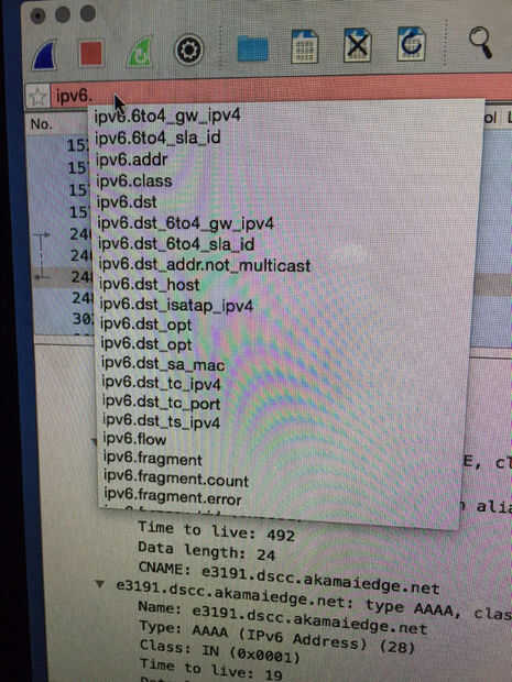Lo segundo más importante para descubrir nuevas palabras clave de filtro de la pantalla es usando la barra de filtro de visualización. Intentará automáticamente sugerir palabras clave basado en lo que ha escrito. Por lo que si quiero empezar a buscar una dirección IPv6 empiezo escribiendo "ipv6." en la pantalla del filtro de la barra (imagen 5).