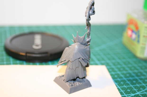 En esta foto puedes ver un pequeño espacio entre los dos pedazos del hombro de la capa. Para quitar esto, simplemente ejecute la espátula a lo largo de la costura hasta que no sienta nunca más. Está bien si es todavía visible, que será cubierto para arriba con la pintura, siempre y cuando sea suave.
