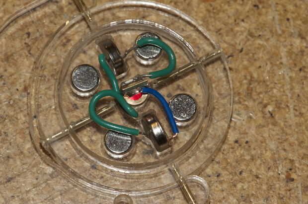 No es bonito y me siento un poco avergonzado acerca de este paso, pero quería que funcionalidad, pronto, así que no Ingeniero sobre cualquier cosa. Conecté los cables a las baterías en mis titulares de ranura de corte del laser poco simplemente presentando surcos con un archivo en forma de V en el acrílico adyacentes las caras de las baterías. AWG22 solo hook-up de alambre era lo suficientemente rígido para que, si las ranuras fueron de disminuir la profundidad, el cable jam entre el acrílico y la batería, conexión útil. Cuidado de pilas de botón son positivos en el cuerpo, negativo en el hoyuelo del botón, a diferencia de las baterías AA o AAA.