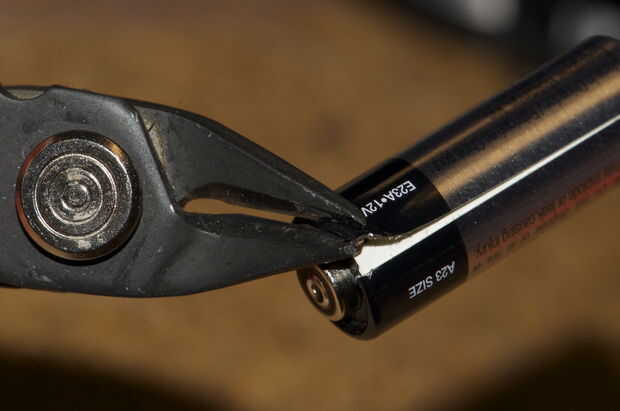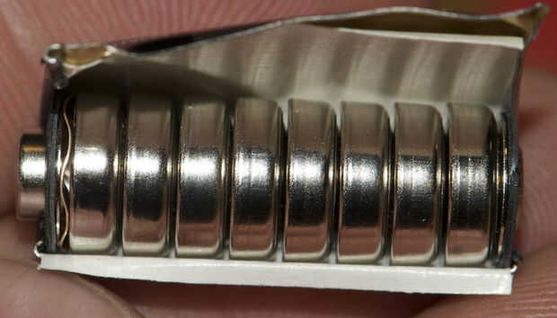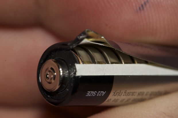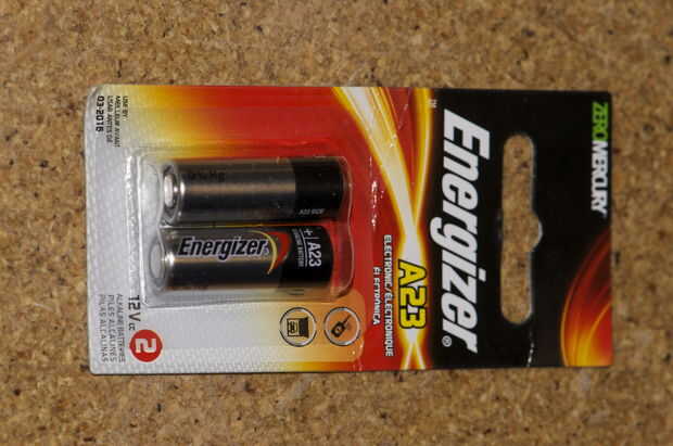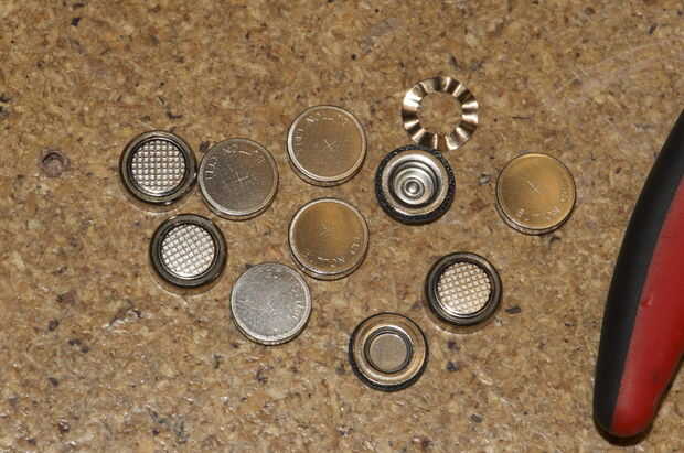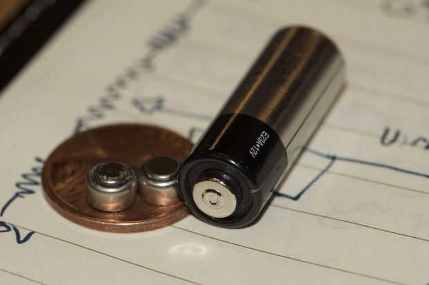 Tengo el más pequeño audífono baterías podría encontrar en la meta local, pero estuvo decepcionado encontrar que muchos del paquete eran plano muerto. pilas de botón de 1.5 voltios que no sean de pilas para aparatos auditivos son muy caros, demasiado! Pilas de botón pequeñas individuales fueron $4 y más. Pero encontré una 12 Voltio batería A23 y recordó que estos tienen muchas células botón separable dentro de ellos. Bingo. Montón de células de pequeño botón de sólo una cuarta parte o menos cada uno. Eran más grandes que las pilas de audífonos, pero adaptado a mi diseño para que encajen y avanzó de todos modos.