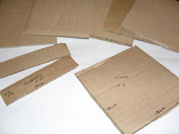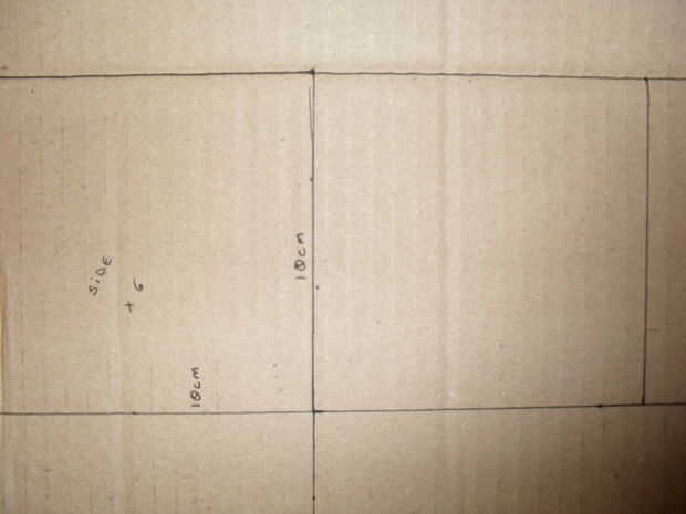 Generalmente cuando hago una caja utilizaría una sola pieza de la tarjeta, y cortar algo como el esquema dibujó en una imagen... Pero... No tengo un gran suficiente pedazo de tarjeta... así que lo que hice fue marcado hacia fuera 6... 10cm por 10cm cuadrados y cortado con mi cuchillo de confianza... Me parece para conseguir buenas líneas rectas... que es mejor usar un buen cuchillo afilado... Recuerde que si usted está usando una regla de plástico, ten cuidado y no cortar las puntas de los dedos!