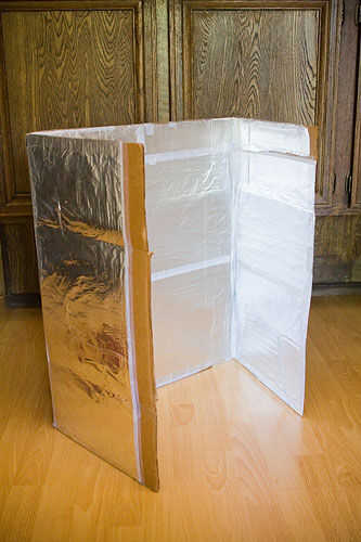 Una vez ha rociado los tres paneles, ahora aplicar el papel de aluminio. Una vez aplicado a la superficie, simplemente puede utilizar el dedo para eliminar las burbujas que se encuentran. Puede simplemente presione en la burbuja y arrastre un borde para deshacerse de ella.