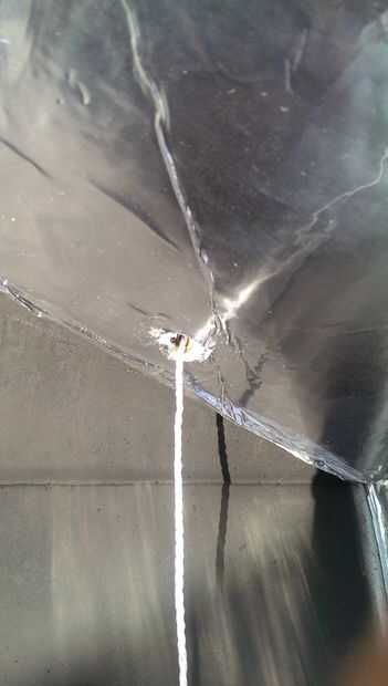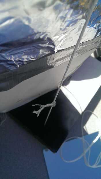 Una vez la pintura se seca, que son capaces de construir ahora. Usar la cadena para pasar por uno de los agujeros. Vamos a empezar con el orificio superior, más izquierdo en el soporte. Una vez que pones la cadena a través de ese agujero, asegúrese de que pasa a través del orificio del reflector izquierdo y sale por el orificio del reflector derecho. Desde aquí, poner la cadena a través del orificio superior, derecho, y ahora la cadena debe cumplir con el origen. Un nudo apretado para que los paneles será estables en posición vertical. Si no está lo suficientemente apretado, se puede repetir el proceso, pero esta vez utilice los orificios segunda hizo en el stand.