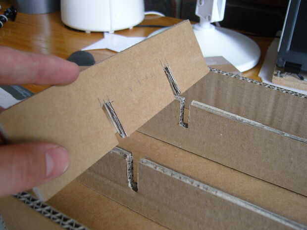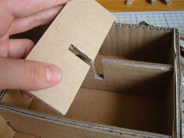 Primero pone dos divisores largos en la caja y luego trabajó hacia fuera donde quería que los más pequeños para ir, una vez que había decidido marcado con lápiz y cortar ranuras en los divisores pequeños y grandes.