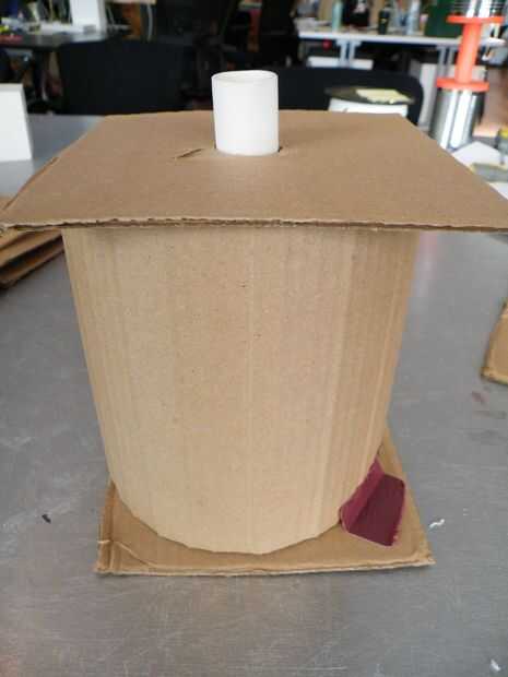 Corte un orificio adecuado en medio de la segunda pieza final, anclada la boquilla en su lugar con más cinta adhesiva, luego montados en el lugar y fijo con... cinta adhesiva para conductos.