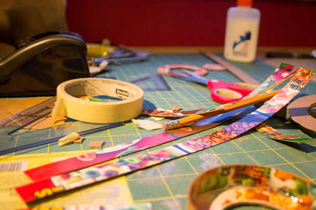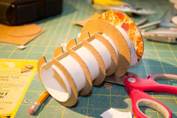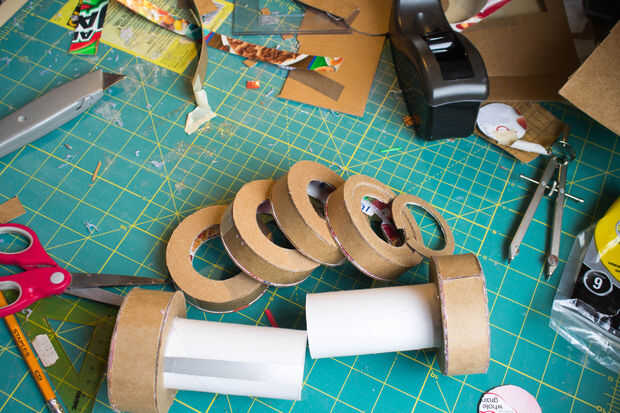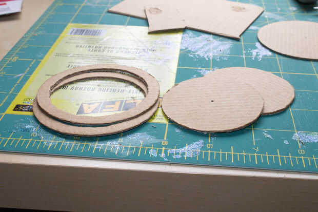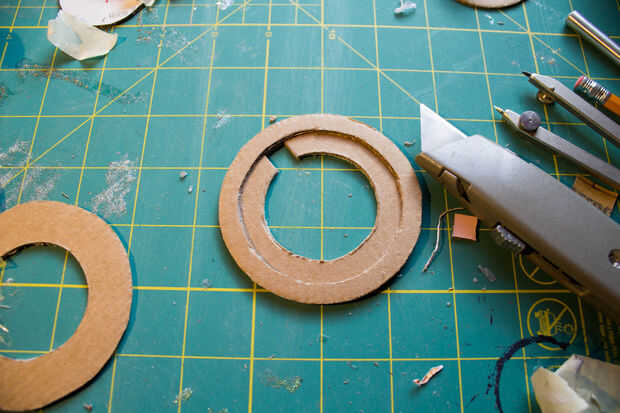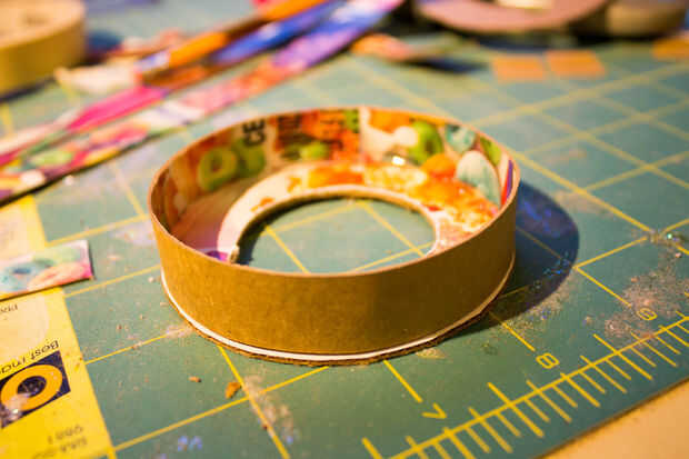 Utilice los círculos sólo construido para trazar y cortar las muescas de los círculos de 80mm con orificios de 45mm. Pegue las tiras de 20mm alrededor de los círculos de 79mm. A continuación, pegue los círculos de 80mm con agujeros de 45mm en el otro lado de las tiras, asegurándose de que las muescas están alineadas. Esto le da un anillo completo.