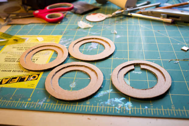 Comenzar pegando el círculo de 80mm con agujero de 65mm en el círculo de 79 m m con el agujero 45 mm. Este círculo exterior se utiliza para ocultar al espaciador. Recorte de la muesca de 10x10m m que se ilustra en las fotos anteriores. Hacer este paso cuatro veces.