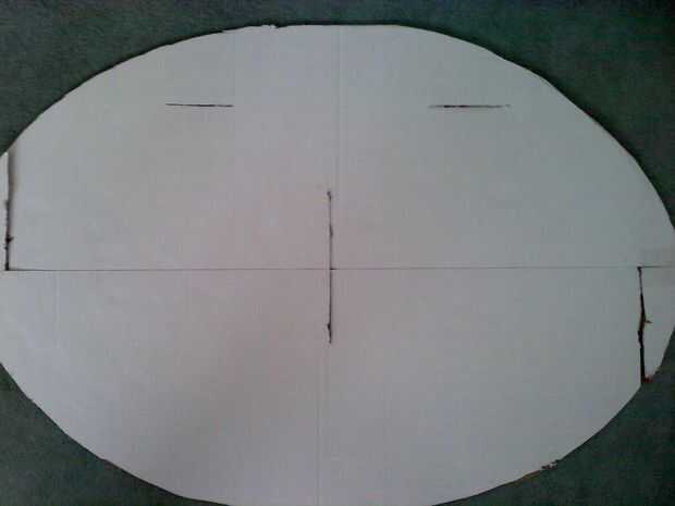 8. entre la línea de centro vertical y el borde de la pieza de traje (cuerpo), dibuje una línea horizontal que es 4" de largo. La línea debe ser 4" hacia abajo desde el borde superior del cuerpo (P1). Hacer la misma línea entre la línea central y el borde opuesto del óvalo. Utilice el cuchillo para uso general (T2) para cortar a lo largo de estas dos líneas. Para ello en la segunda pieza de cuerpo oval (P1).