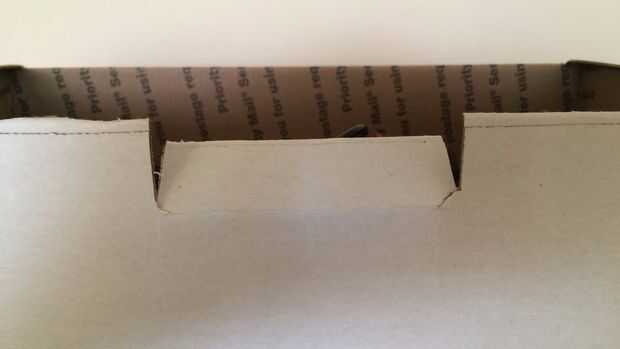 Corte aproximadamente 3/4 pulgadas de 4 pulgadas de ancho en el centro delantero de la caja. Pliegue el mango hacia adentro de la caja y cinta hacia abajo.