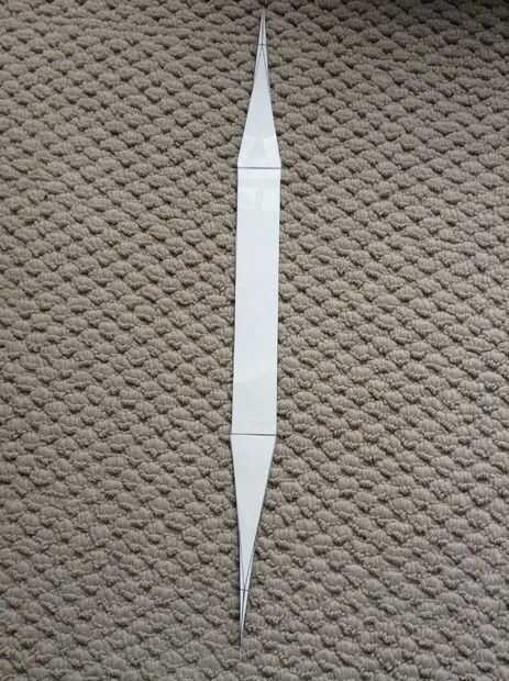Cinta los dos triángulos y el rectángulo grande juntos como se muestra. Lo mismo para las otras cuatro piezas, usted debe tener tres piezas de cartón.