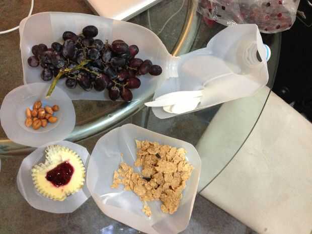 4. este envase se puede utilizar para la celebración de nachos, cereales, frutas. Los envases secundarios pueden usarse para guardar magdalenas, salsas, queso y tal. La parte restante de la segunda caja de leche con el mango se puede utilizar como titular de la cuchillería.