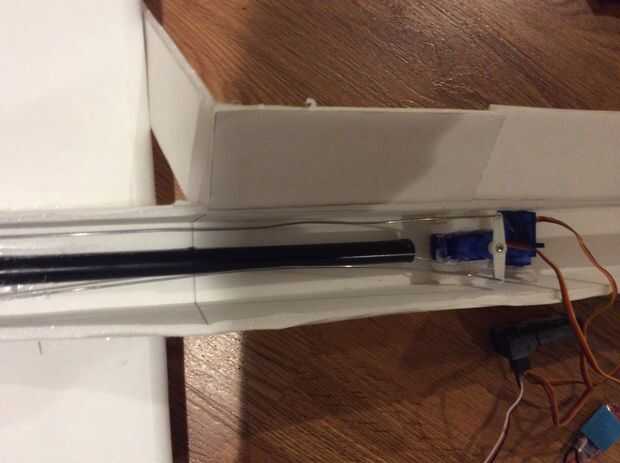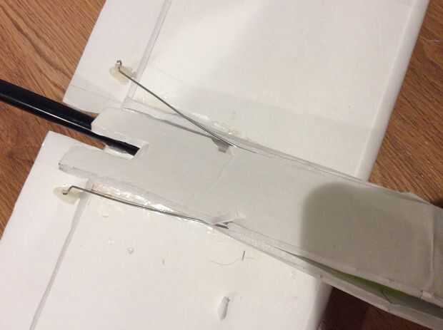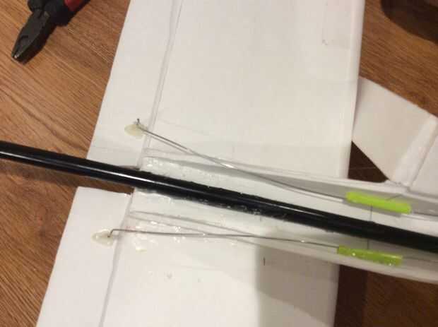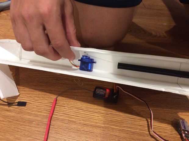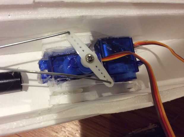 Los vínculos de control transfieren de movimiento de los servos a las superficies de control. Vamos a empezar con el ascensor. Primero, pegue el horn de control a la parte superior de la superficie de control del ascensor, con es agujeros por encima de la bisagra, luego fije el resorte o banda de goma en el orificio superior de la bocina, conecte el otro lado del resorte o banda elástica para otro cuerno de control, otra vez en el agujero superior y fije eso Cuerno del control en un punto sobre el estabilizador horizontal donde hay una luz medio tirar cuando el ascensor está en el posición. Después de esto, pega un cuerno de control a la parte inferior de la superficie de control de elevador y atar el extremo de la línea de pesca al servo en el orificio superior de la horn. Ahora debe encender el radio y alimentar a su receptor. Esto evitar que los servos se muevan y le centro de la superficie de control sin necesidad de utilizar los ajustes limitados en su radio. Tensar el sedal y haga un nudo alrededor del cuerno, ajustándolo para que la superficie es plana sin ti sosteniéndolo. Una vez que esté seguro comprobar el acoplamiento de control moviendo el stick derecho en la emisora. La superficie debe moverse. Pasar a alerones; Tendrá dos tramos de 15 pulgadas de alambre, alicates de punta fina y 2 cuernos de control más para este paso. Doblar un extremo de cada una de las secciones de cable en una curva en forma de "Z", aproximadamente 1/4" entre curvas. Inserte estos extremos en los brazos de servos de alerones en los agujeros exteriores. Pegar los cuernos de control para que los agujeros están alineados con la bisagra. Doblar el alambre que pasa por los orificios superiores de los cuernos de control a una distancia donde las superficies de control estén nivelados con la parte inferior del ala. Completar la curva Z para fijar el cable en su lugar y cortar el alambre sobrante. Prueba moviendo el stick derecho de transmisores. Deben mover los alerones en direcciones opuestas.