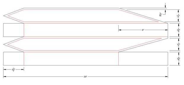 20 pulgadas de largo y cónico de la forma, donde hay dos líneas rojas estrechamente adyacentes es un espacio de 3/16 de pulgada entre las reducciones de la puntuación.