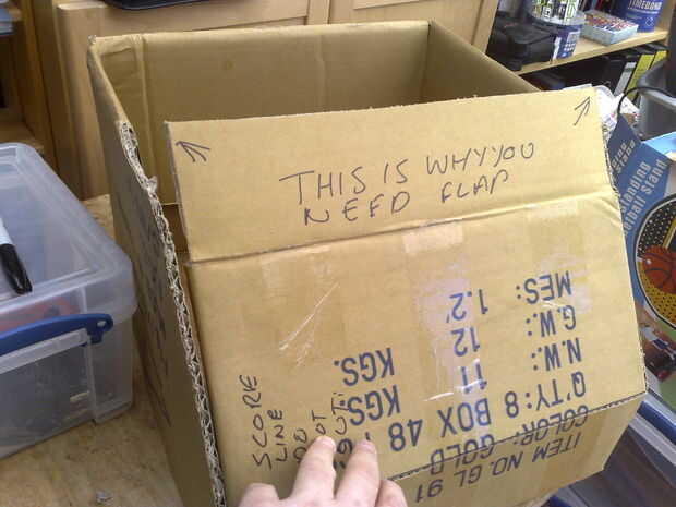 Doblar las aletas dentro de la caja agregar estructura y dar un respaldo de los spoilers y escapes. también mejorará la elasticidad de la caja.