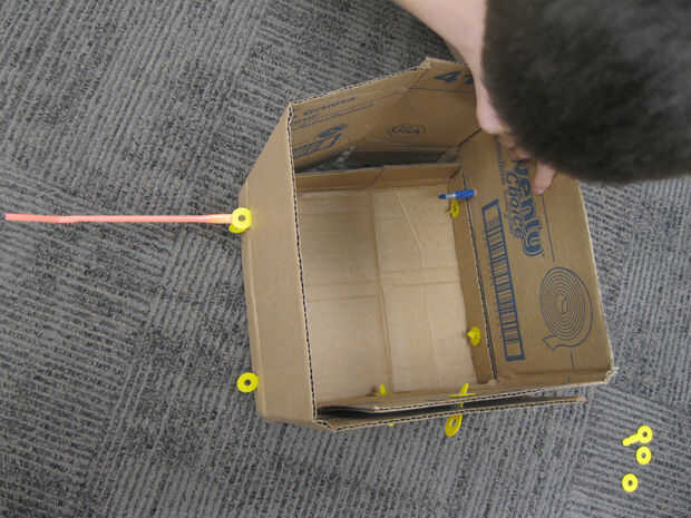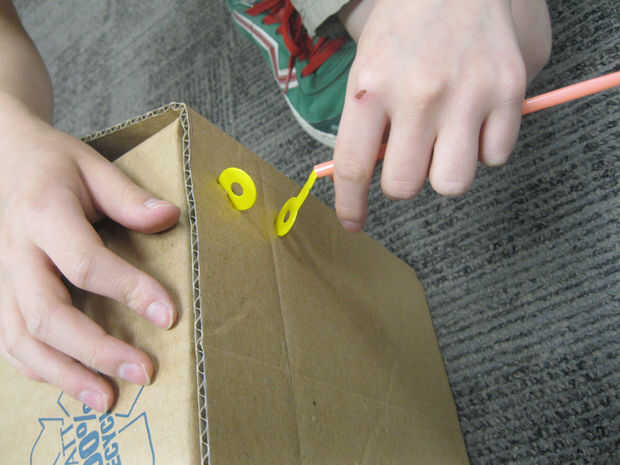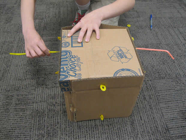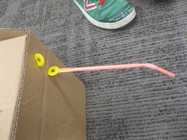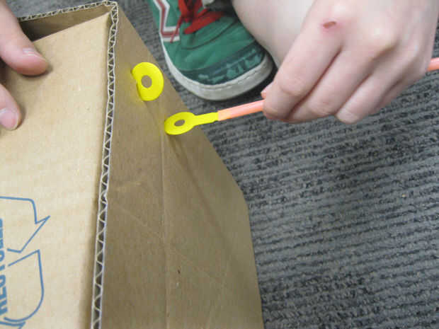Ahora, utilice el lápiz para perforar un agujero en cada lado donde desee los cuernos para ir. Empuje un Strawbee de dos brazos a través de cada uno de ellos y asegurar en el interior con un círculo Strawbee. Luego, pegar una paja bendy en el exterior de cada uno de ellos.