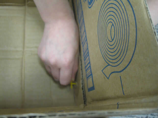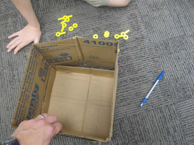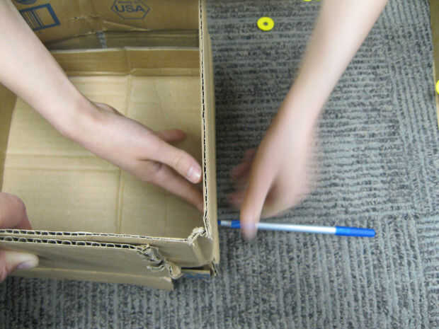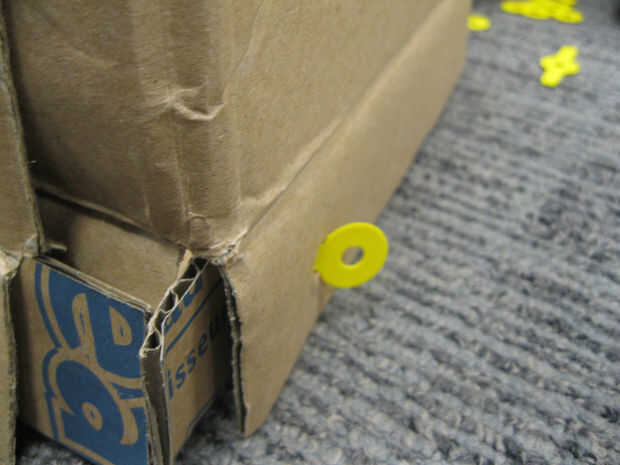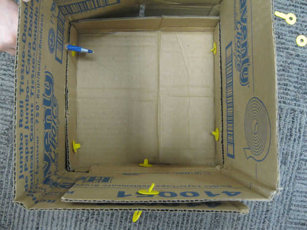 A continuación, utilice un bolígrafo u otra cosa puntiagudo para perforar agujeros a través de los lados y también las aletas de la pieza superior. Hacer dos agujeros para cada pestaña del lateral y dos orificios de conexión de la solapa de superposición en el lado. Ahora, empuje Strawbees de un brazo desde el exterior a través de cada uno de estos agujeros. A continuación, utilice el círculo Strawbees para asegurar el interior de cada uno de ellos.