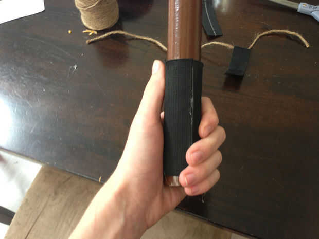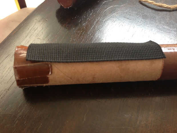 Ahora para hacer el mango. Tomar las correas de la mochila y pegar como esta en la zona marcada como mango. Hacer todo esto alrededor del tubo. Debería verse como la foto inferior.
