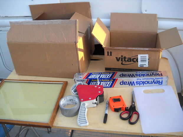 este instructable es sobre un horno solar hecho de un marco antiguo, dos cajas de cartón, algunos conducto cinta, papel de aluminio, cola blanca y periódicos arrugados. Usted necesitará encontrar un marco de imagen. Yo cristal regular pero vidrio templado sería mejor ya que hace mucho calor y podría hacerse añicos si se derrama agua fría en él. Creo sobre un marco de 12 x 14, no estoy seguro como lo fue hace unos años. Lo de tamaño de cristal encontrará decidirá el tamaño de la caja interna y la caja de outter debe ser 2-3 pulgadas más grande. Usted necesita cortar un agujero en la caja más grande para caber el interior caja deformación luego periódico y paquete entre ellos.