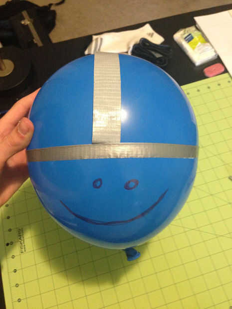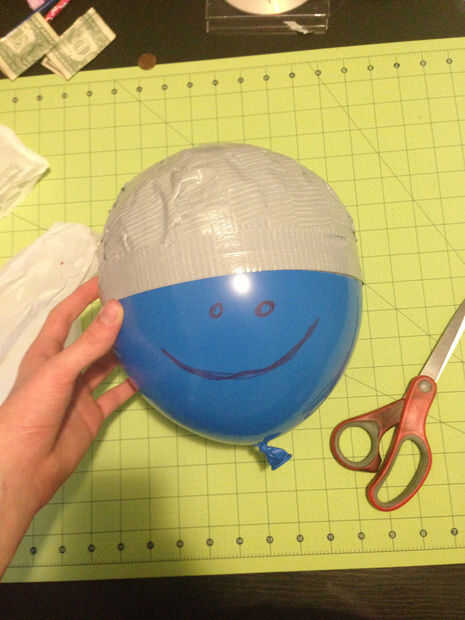 Ahora, aguantar el lado pegajoso de la cinta en toda la zona del casco. Al principio, traté de pegar las piezas debajo de la "banda" pero que tardó demasiado por lo que envuelve un lado pegajoso de la pieza la "diadema". Trate de no dejar muchos forma de burbujas de aire.