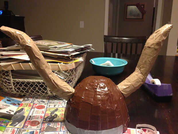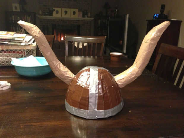 Pegamento y cinta adhesiva los cuernos en su casco. Luego agregar algunos detalles.