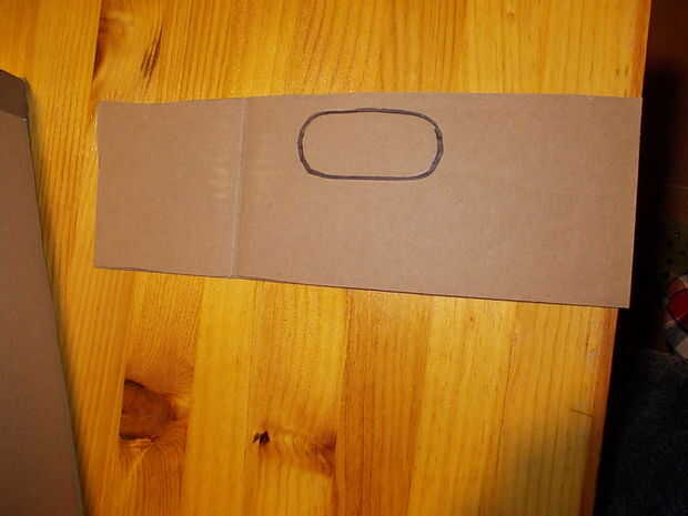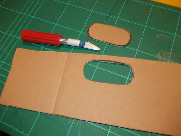 Corte los orificios uno o dos (depende de sus preferencias, hacer uno con dos asas y dos con una sola...) cerca de la parte superior de la pieza central, con medidas de 10 cm de ancho y 3 cm de altura.