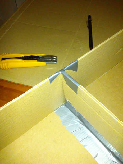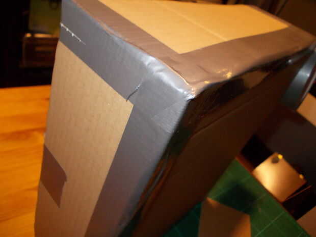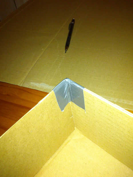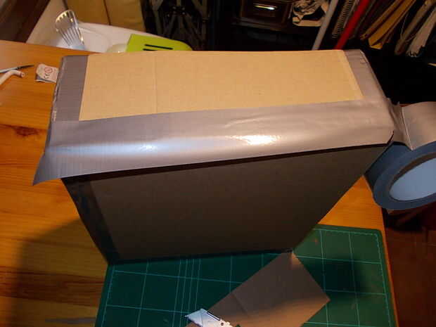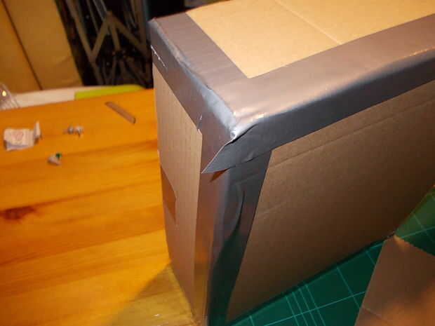 Para los acabados, colocaremos precinto en todas los cantos superiores. Para las puntas y ángulos cortaremos el precinto en diagonal para una vez pegado el precinto, palos esta punta y quede más bonito. Colocamos tanto precinto cómo creamos, siempre procurando que no queden arrugas ya afean mucho el resultado final.