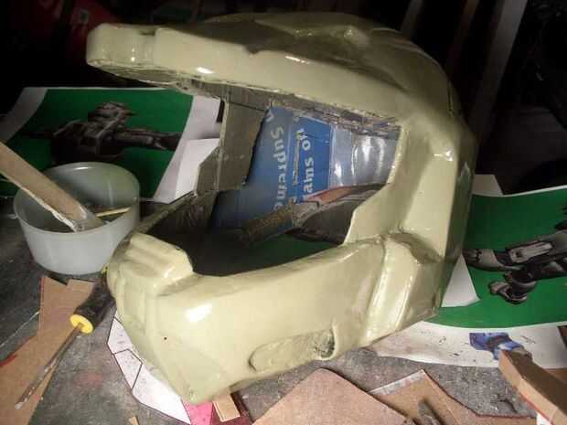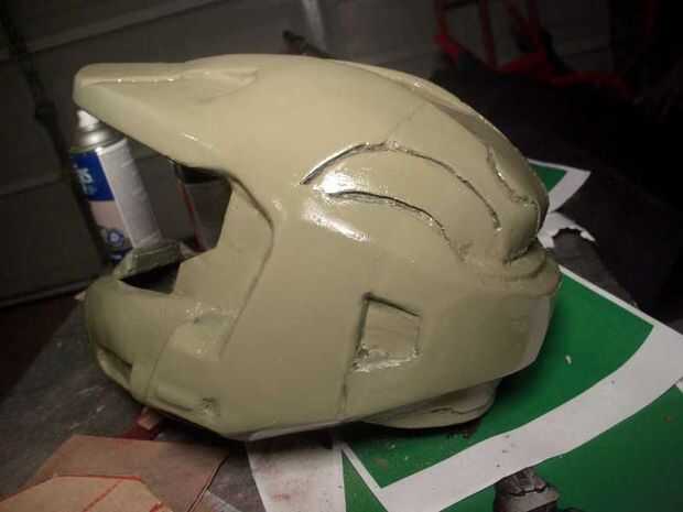 Después de dejar que la capa final de curación de la pintura durante 24 horas soportó el casco rociando una pequeña zona con el primer automóvil gris oscuro e inmediatamente limpiar la mayor parte de él. Una vez este seco, seco cepillado plata pintura para hacer el casco se vea desgastada de años de batalla.