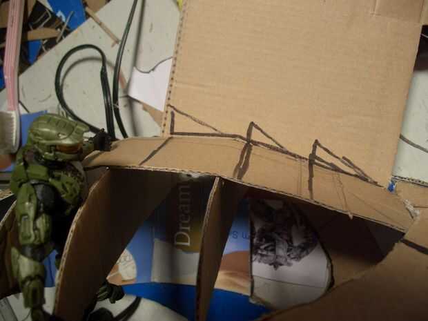 La cubierta posterior se instaló y luego se hizo un patrón de la forma de las muescas en la parte superior plana. Piezas de cartón se corte y doblados a lo largo del ángulo agudo de la superior y pegados a la parte superior.