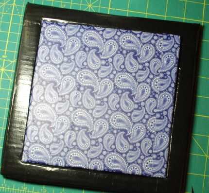La plaza que fue cortada de la pieza de arriba debe cubrirse en cualquier color de cinta de conducto contrastante o patrón te gusta.  Fui con cinta adhesiva para conductos paisley azul... porque es cinta azul de paisley.