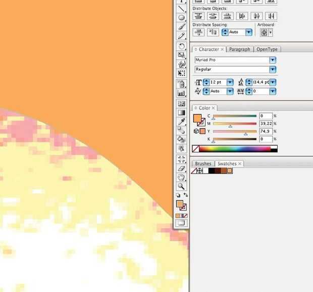 Asegúrese de que las formas se unen (con Cmd/Ctrl + J). Ahora usted puede empezar a llenar, utilizando la herramienta Cuentagotas para seleccionar colores de la capa de 'Posterizar' (también puede almacenar en el panel muestras). Si algunas formas se superponen, copiar y seleccione las formas que deben ser divididos, luego ir al panel Buscatrazos (Cmd/Ctrl + Shift + F9) y presione el botón de división. Desagruparlas (Cmd/Ctrl + Shift + G) y eliminar las piezas que no necesita. No olvide agrupar después (Cmd/Ctrl + G).