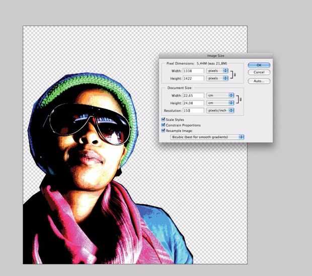 Ahora cambiar la resolución a 150dpi y la altura hasta un máximo de 25cm; Esto hará que el archivo de Illustrator posterior más pequeño. Guárdelo como un PSD.
