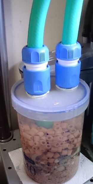 Esta es mi segunda generación. La primera de ellas no funcionaba bien. La primera vez que traté de pegar la manguera directamente en el envase usando caliente derretimiento pegamento. Confía en mí, desea la rápida Conecte conectores, y desea utilizar epoxi. Pegamento caliente del derretimiento no funciona especialmente bien con cosas flexibles y se filtraron en todas partes.