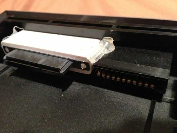 Una vez que has cortado suficiente espacio para el adaptador, utilice una pistola de pegamento caliente para mantenerlo correctamente en su lugar. Luego utiliza un cable de extensión USB y funcionó a lo largo de la carcasa de la consola y le salió por el puerto de video RCA. Utilizamos tijeras para cortar el puerto y deje un espacio para el cable.