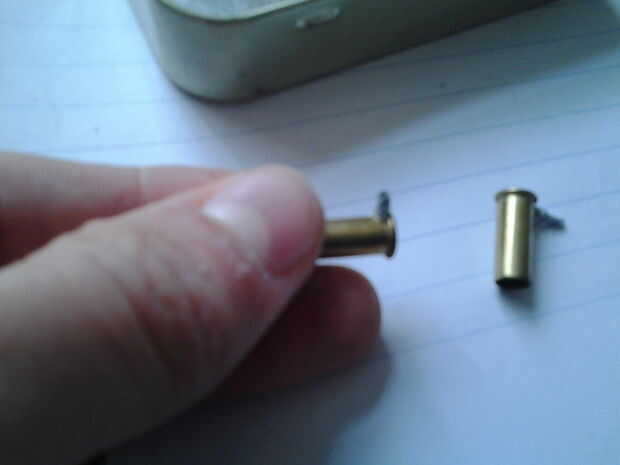 Mini pistola modelo hechas de pino y una gastado latón.22 magnum.Suministros necesarios-.22 cartucho de latón de la botella doble-.5in x 1 x 4 en el pino de la pieza de blanco-talla knive(s)-distintos grados de papel de lija-algún tipo de pegamento,