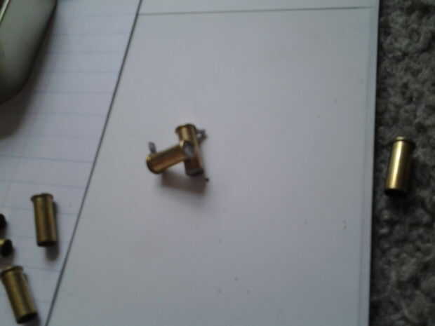 Mini pistola modelo hechas de pino y una gastado latón.22 magnum.Suministros necesarios-.22 cartucho de latón de la botella doble-.5in x 1 x 4 en el pino de la pieza de blanco-talla knive(s)-distintos grados de papel de lija-algún tipo de pegamento,