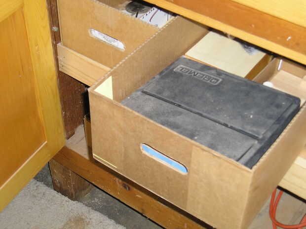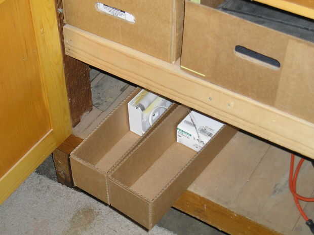 Cajones hecho de cartón, para caber exactamente debajo de la mesa de trabajo. Esta forma, se utiliza todo el espacio y acceso se hace fácil, simplemente tirando hacia fuera "el cajón".
