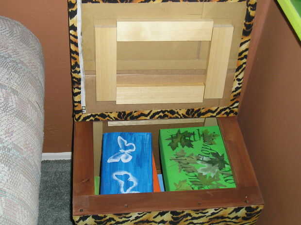 Este cofre de almacenamiento útil se duplica como un taburete del pie. He añadido un marco interior de pino, por lo que uno puede sentarse en él. Es muy fuerte.